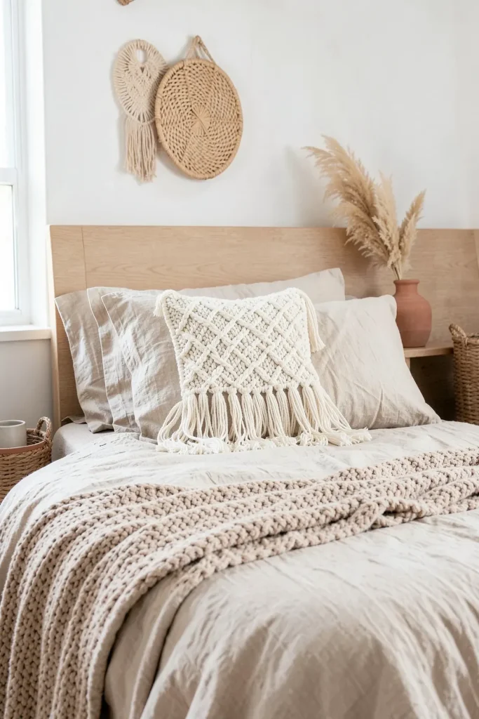 Le macramé, avec ses nœuds complexes et ses longues franges, apporte une touche bohème. La corde épaisse en coton confère au coussin un poids agréable et une texture unique qui contraste avec les tissus lisses. Très agréable au toucher, il ajoute une note artisanale à votre canapé ou votre lit.