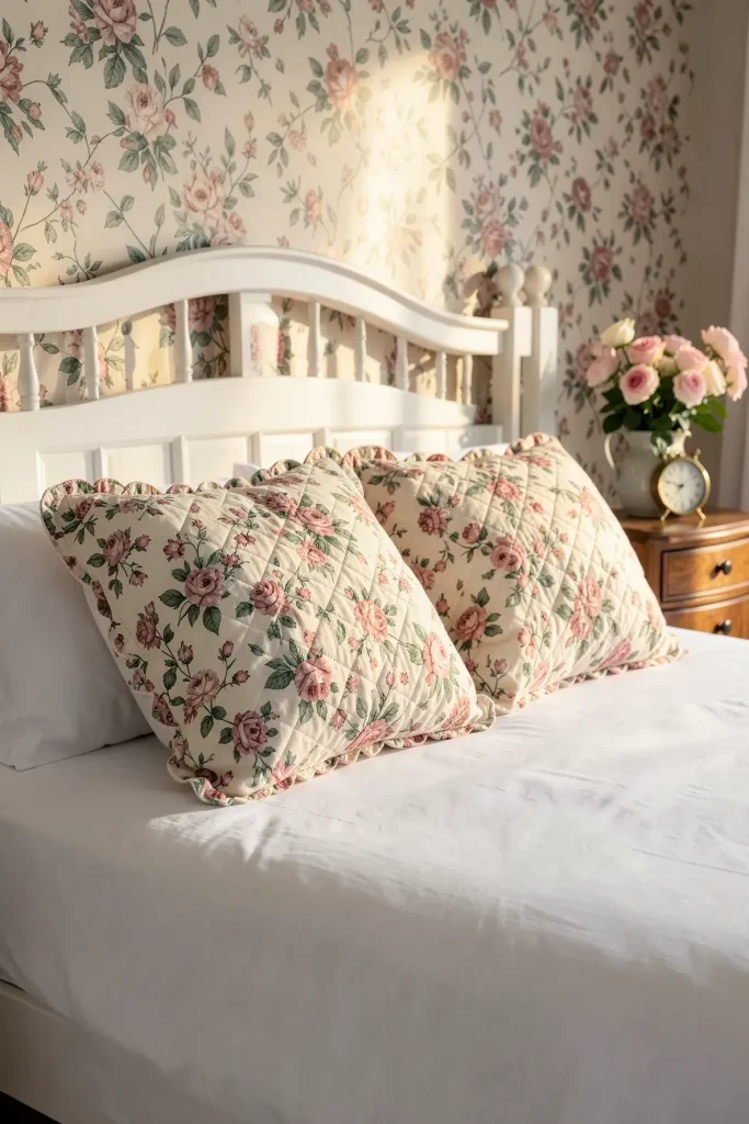 Les surpiqûres matelassées confèrent à ce coussin un léger rembourrage et une allure classique. Les bords festonnés apportent une touche de douceur et de raffinement, soulignant son aspect soigné. Les motifs floraux, généralement traditionnels, créent une atmosphère chaleureuse et accueillante dans une chambre ou une chambre d’amis.