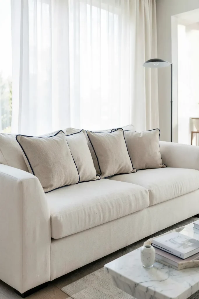 Pour un style épuré et soigné, le lin uni avec passepoil contrastant est un excellent choix. Le passepoil, une fine bande de tissu de couleur différente, souligne les coutures et met en valeur la forme du coussin. Ce détail subtil confère à un coussin ordinaire une allure beaucoup plus luxueuse.