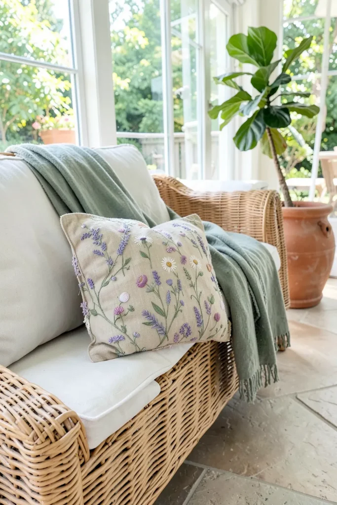 Le lin est une matière respirante et résistante, et la broderie lui confère une touche d’originalité. Les motifs de fleurs sauvages apportent une note de nature à l’intérieur, sans être trop présents. La texture du fil sur le lin lisse crée un contraste agréable au toucher.