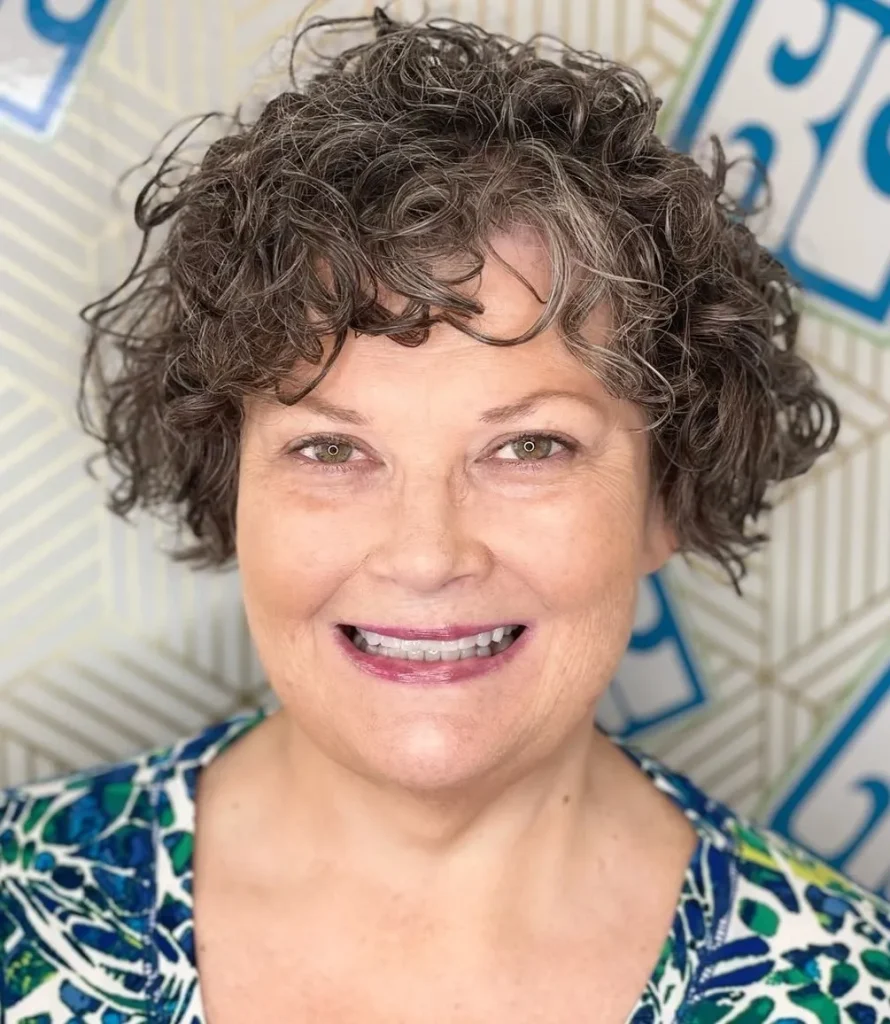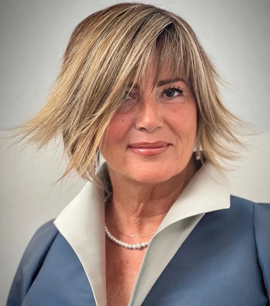 Avoir 60 ans est une excellente raison de changer de style et de se faire une nouvelle coupe ! Essayez cette coupe shaggy blond argenté avec des boucles dégradées et une frange épaisse pour mettre en valeur la texture naturelle de vos cheveux.