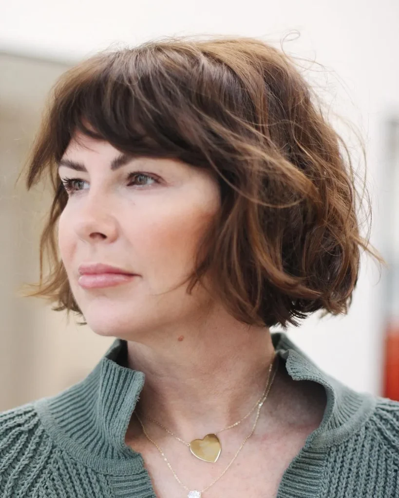Ce carré décoiffé vous permettra de rester jeune et en pleine forme. Sublimez votre style avec une frange rideau et des mèches subtiles pour créer une jolie dimension et être au top à tout âge ! Vous pouvez également essayer différents styles et visualiser leur rendu grâce à un générateur de coiffures basé sur l’IA .