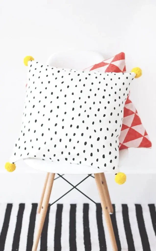 Donnez instantanément du cachet à vos coussins et créez une ambiance chaleureuse et accueillante. Et non, sans vous ruiner ni vous compliquer la vie ! Il vous suffit d’un peu de créativité et d’un brin d’envie de faire du bricolage. Grâce à cette idée DIY, vous pouvez facilement transformer un coussin uni en un véritable bijou décoratif, à pois, à motifs ou orné de détails, pour votre salon ou votre chambre. Quelques points de peinture sur un coussin uni suffisent à créer un effet saisissant. Mais fixer des morceaux de laine duveteuse de couleurs contrastées aux quatre coins du coussin rehausse instantanément le style recherché.Source :