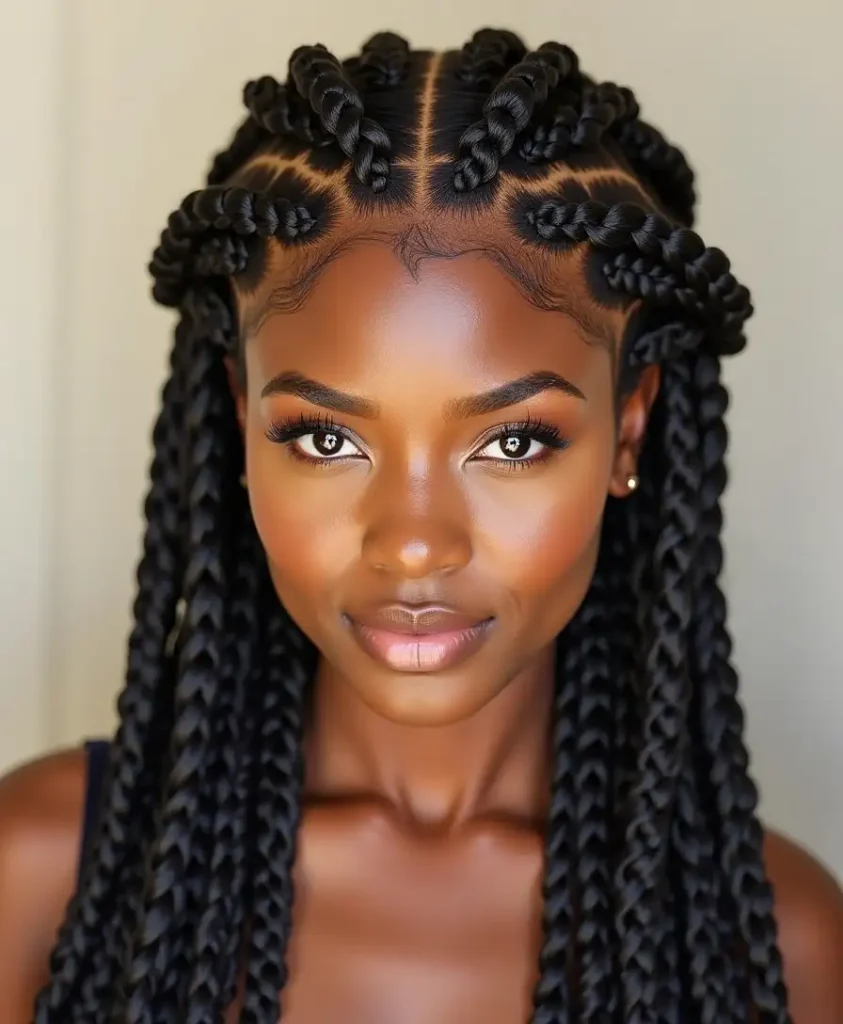 Pour sublimer vos tresses africaines, optez pour une finition symétrique et élégante avec une raie centrale bien marquée .