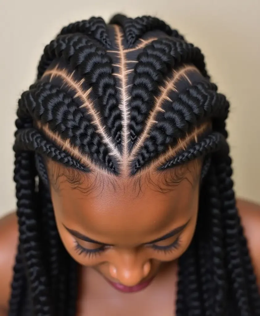 Bon, parlons des tresses africaines avec une raie au milieu affirmée, car, croyez-moi, le but est d’attirer tous les regards avec ces motifs audacieux !