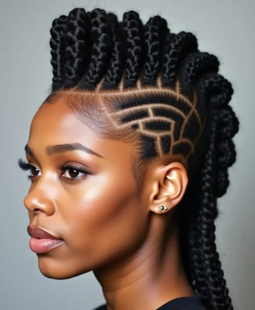 La coiffure Mohawk tressée, unique en son genre , transforme votre chevelure en un look audacieux et captivant . Parfaite pour ajouter une touche d’originalité à votre quotidien, elle allie un tressage complexe à un style spectaculaire.
