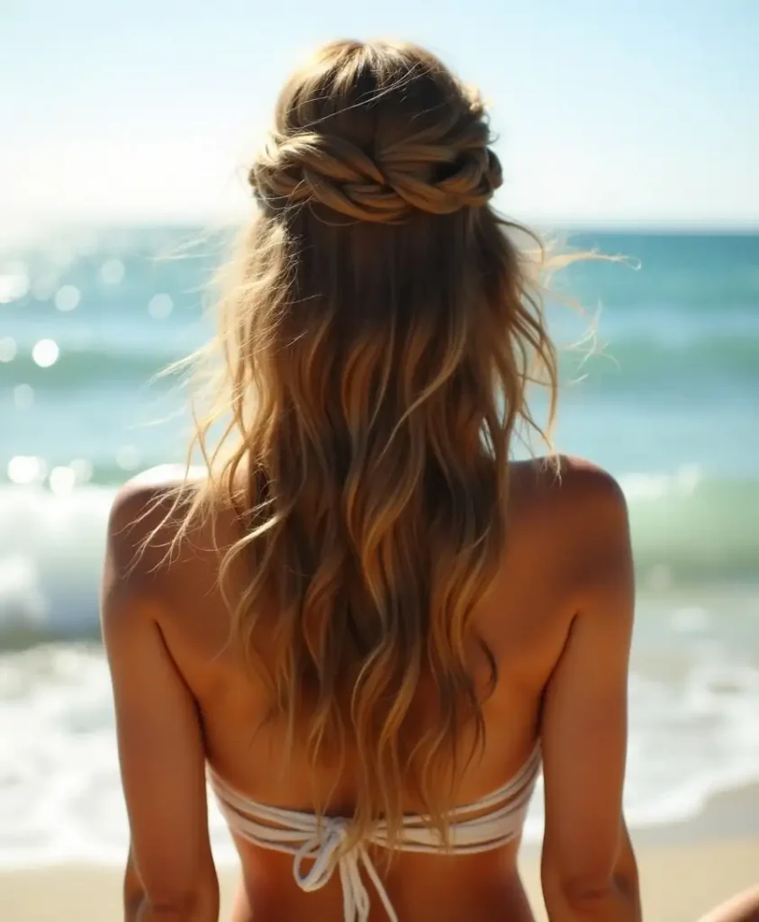 Même si le soleil brille de mille feux, il faut rester pratique côté coiffure, et c’est là que la coiffure mi-attachée mi-détachée entre en jeu : elle offre le meilleur des deux mondes. Parfaite pour dompter les cheveux rebelles après la plage tout en laissant s’exprimer vos ondulations.