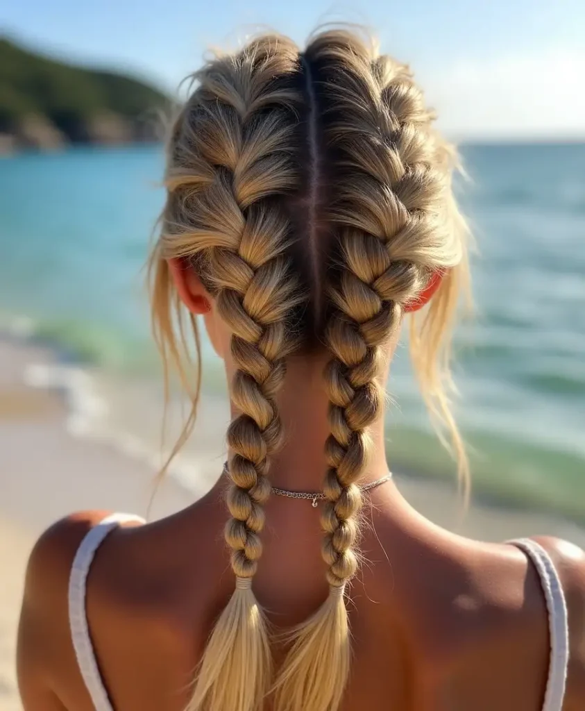 Quand il s’agit d’allier praticité et fantaisie, les tresses hollandaises doubles sont idéales pour une journée à la mer. Elles offrent une coiffure élégante et bien fixée, qui résiste à la brise marine. Commencez par faire une raie au milieu.