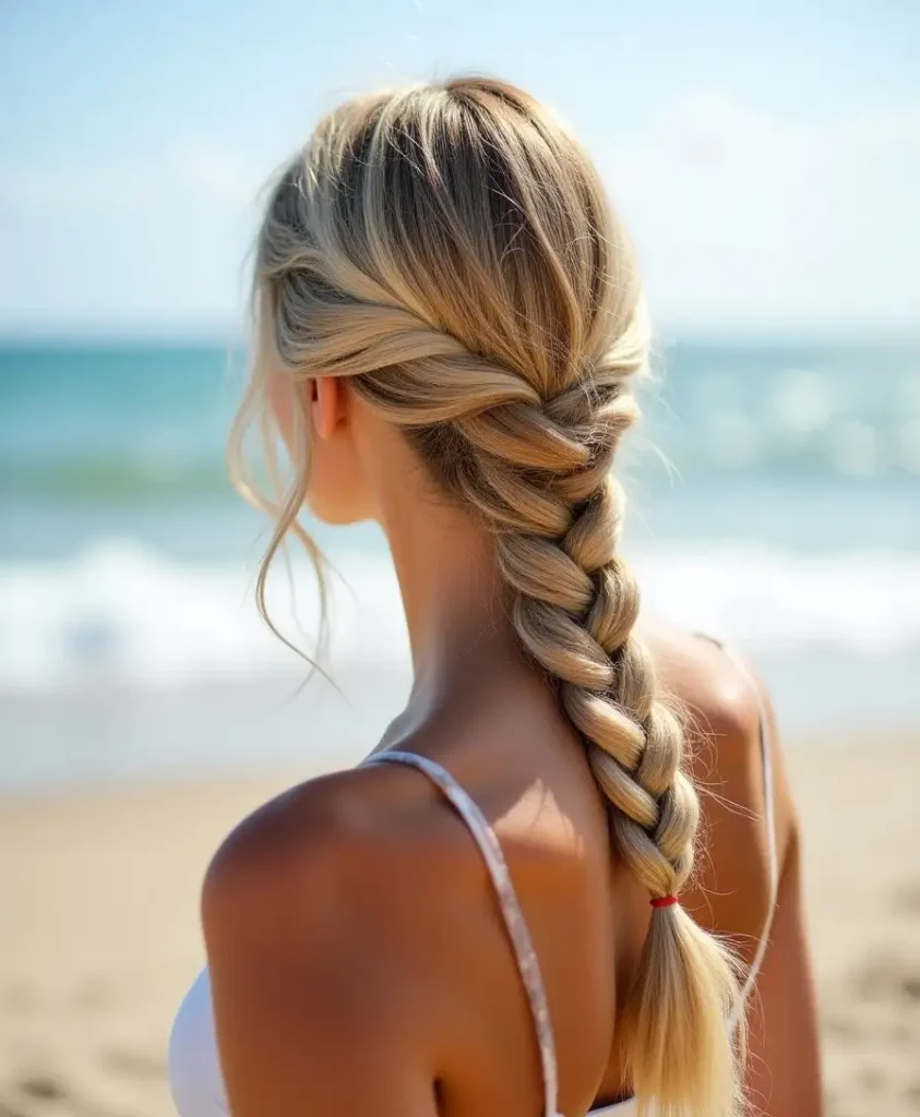 Vous cherchez une coiffure de plage à la fois élégante et décontractée ? Essayez la tresse en épi ! Ce style est parfait pour les journées de plage où l’on se sent à l’abri des miroirs.