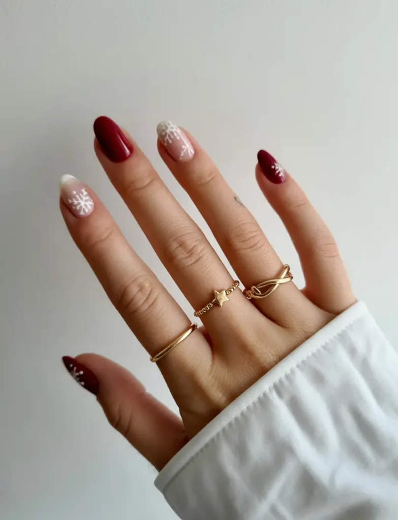 Les ongles rouges ne se démoderont jamais, mais ce design les réinvente. Des teintes rouge canneberge foncé et des tons neutres laiteux, ornés de flocons de neige blancs délicats, évoquant les fêtes de fin d’année. Une manucure festive sans être ostentatoire : une manucure à la fois confortable et nostalgique, mais suffisamment moderne pour être toujours tendance dès les premières semaines de 2026.