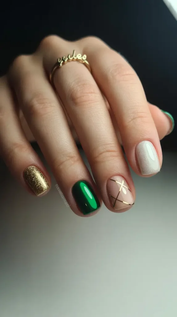 Et si vous êtes attirée par les couleurs opulentes et les détails dorés, ce look vous séduira. Un mélange de doré métallisé, de beige crémeux et de vert profond crée un contraste à la fois festif et élégant, parfait pour célébrer les fêtes. C’est le genre de manucure idéale pour passer facilement du travail aux sorties nocturnes.