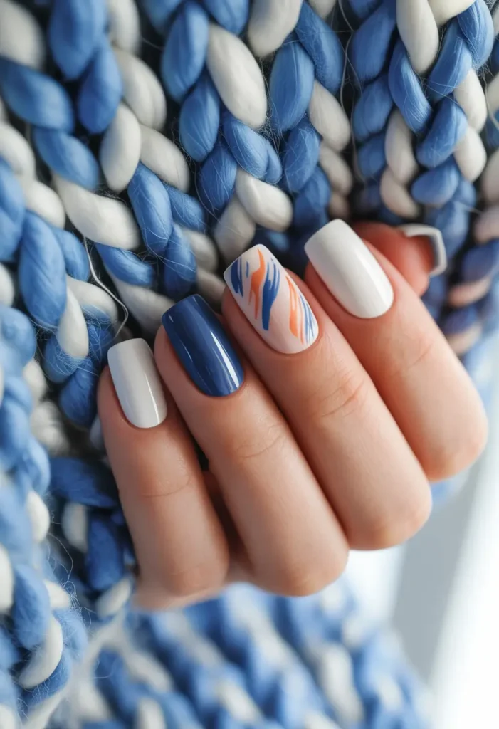 Dès que je vois ce motif, il évoque instantanément les matins froids d’hiver et la douce chaleur réconfortante d’une écharpe en maille. Le mélange de bleu marine et de blanc pur, rehaussé de touches de corail chaud, lui confère une fraîcheur et une chaleur incomparables. Un style épuré et plein de personnalité, idéal pour la douce transition entre les fêtes et le début de janvier. Cette manucure est synonyme de sérénité, comme ce moment où l’on serre ses mains autour d’une tasse de chocolat chaud et où le silence s’installe.