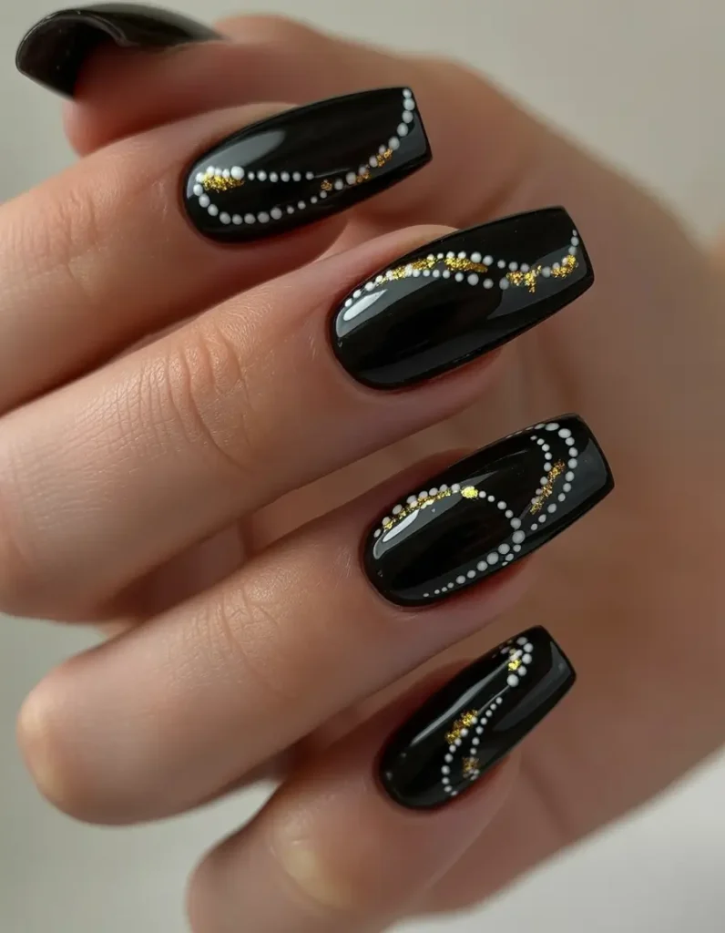 Tout cela est un mystère : des ongles noirs recourbés, parsemés de points blancs et de paillettes dorées. Audacieux et élégant, c’est un clin d’œil aux longues nuits d’hiver et aux ciels scintillants. L’or chromé et le noir brillant évoquent les constellations, et cette manucure est idéale pour toute amoureuse de la beauté céleste.