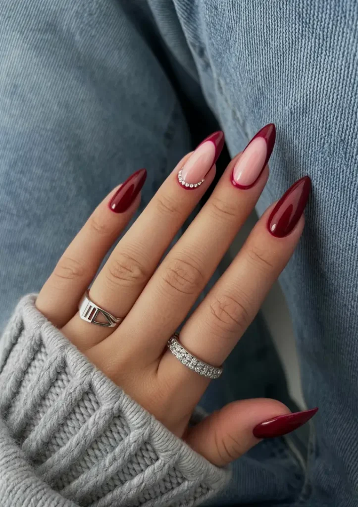 Une manucure française revisitée, avec des côtés carmin et une base rose poudré : contemporaine, spectaculaire et résolument féminine. J’adore la courbe ornée de strass, suffisamment discrète pour apporter une touche festive sans en faire trop. Ravissante et romantique, elle est idéale pour un rendez-vous romantique en hiver.