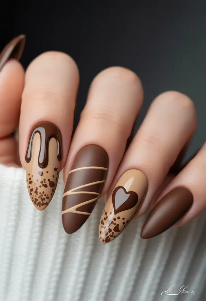 Imaginez une manucure qui évoque votre chocolat chaud préféré. Chocolat au lait, caramel onctueux et nuances moka se mêlent dans un dégradé subtil de coulures, de cœurs et de tons chauds. Luxueuse, gourmande et réconfortante, cette manucure offre un style simple et élégant, comme se réchauffer les mains autour d’une tasse de chocolat chaud par un matin d’hiver.