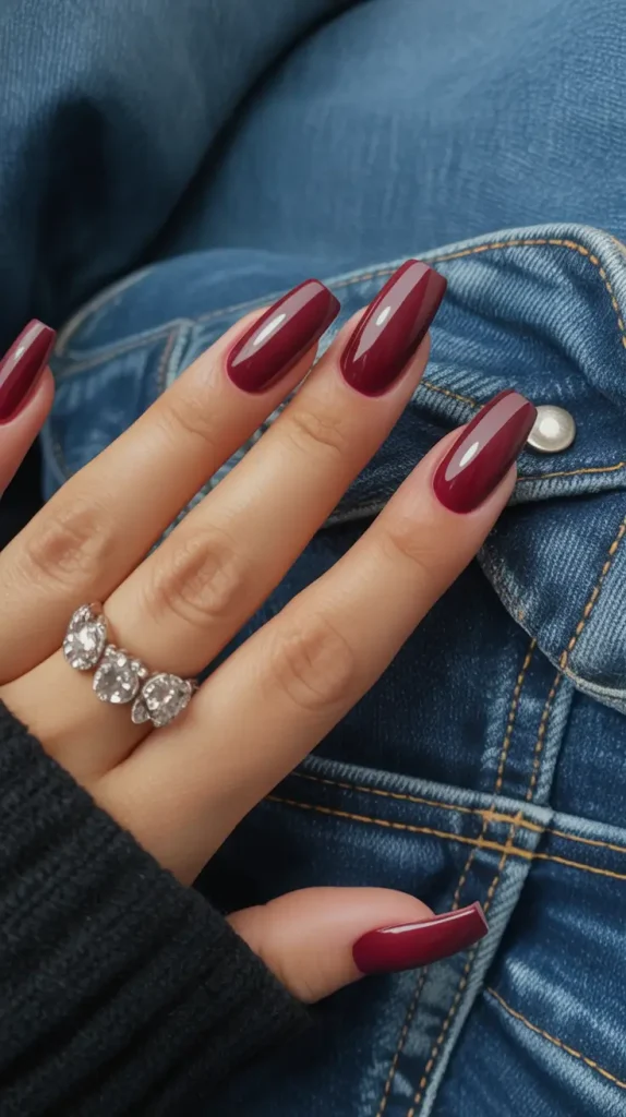 Pour obtenir ce rendu, je recommande OPI Malaga Wine ou Essie Berry Naughty. Appliquez une couche épaisse de gel pour un fini lisse, brillant et une tenue optimale. Conservez une forme carrée ou légèrement arrondie pour intensifier la couleur.