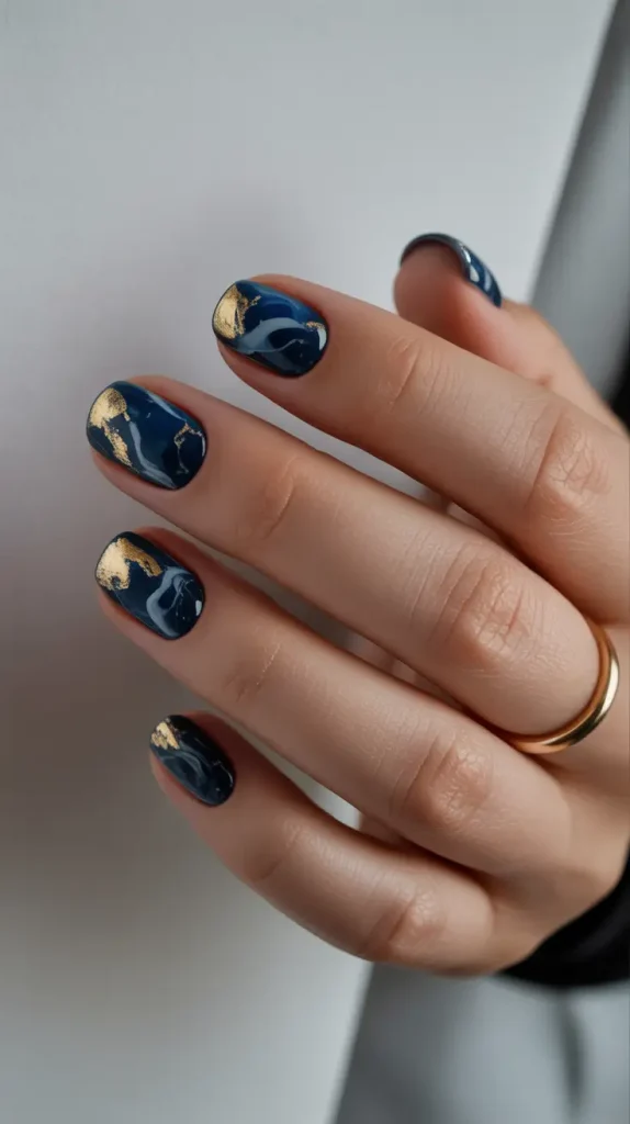 Ce vernis à ongles, d’un bleu profond mystérieux, est rehaussé de reflets fumés et de touches de feuille d’or. Il est idéal pour un dîner d’hiver, à la lueur des bougies, au son d’un jazz feutré. L’alliance du foncé et du métallique lui confère une élégance presque royale, parfaitement en phase avec les tendances 2025-2026.