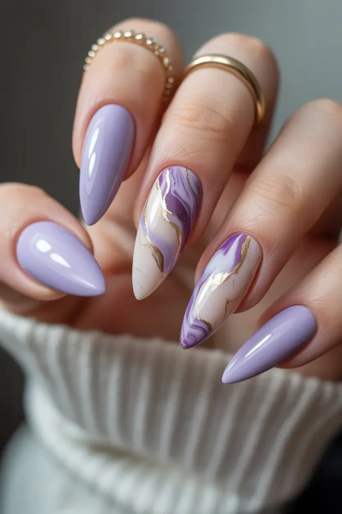 Je vous suggère le vernis gel Modelones couleur Amethyst Dream pour obtenir la nuance lavande et le gel Gold Chrome de Born Pretty pour les lignes métalliques. Mélangez les couleurs avec un pinceau fin et catalysez sous lampe UV. Le résultat est liquide, comme des nuages figés.