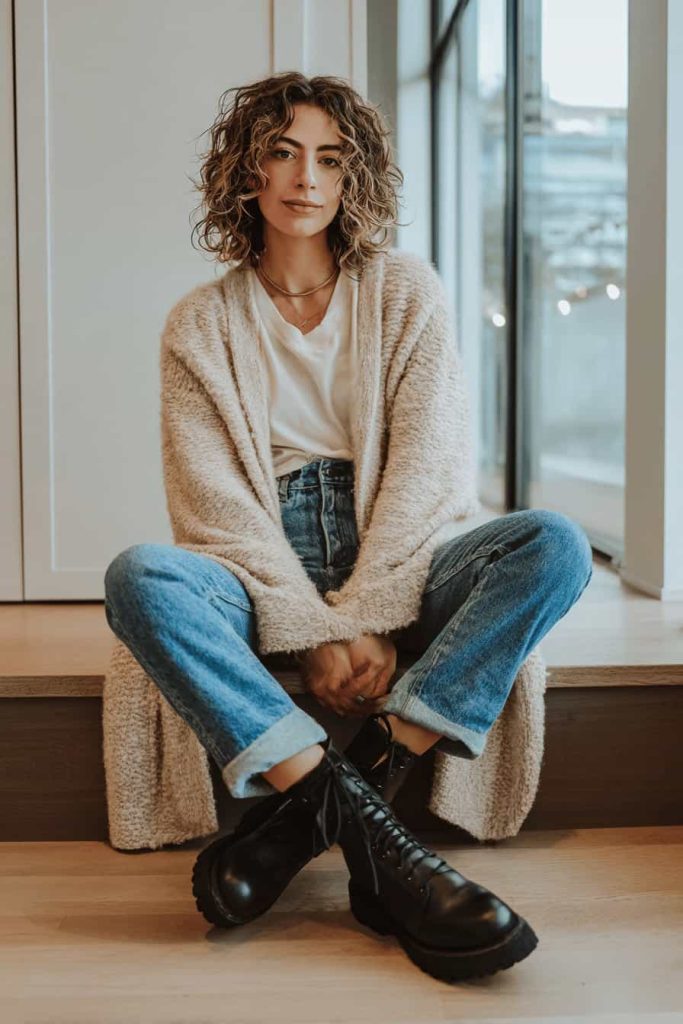 Tenue décontractée d’hiver : jean mom et gros cardigan