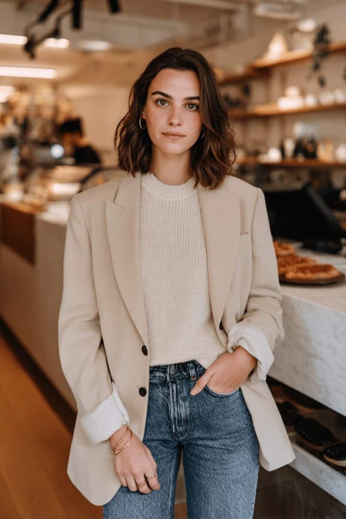Cette tenue illustre comment un blazer oversize se marie avec décontraction à un gros pull en maille aux tons naturels. Le jean taille haute structure la silhouette et lui confère une allure décontractée. Le mélange des styles est essentiel : l’élégance rencontre le confort.