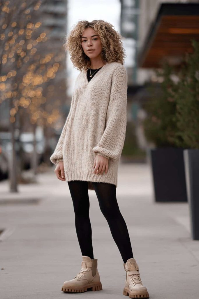 Si vous ne voulez pas souffrir du froid en hiver tout en restant stylée, ce look est fait pour vous. Des bottines à semelles épaisses associées à une robe en maille décontractée dégagent instantanément une impression de bien-être.