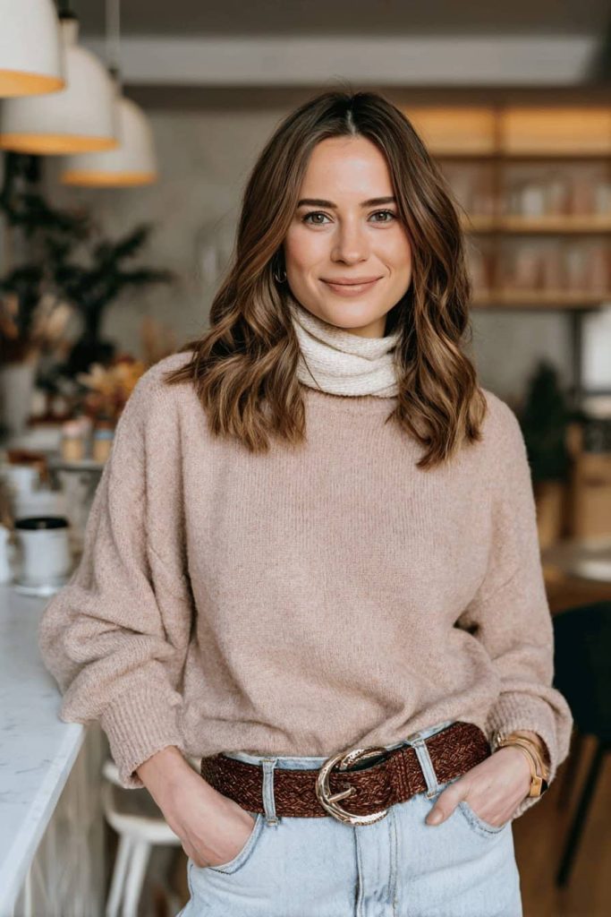 Tenue d’hiver pour femmes rondes : jean taille haute et ceinture tendance