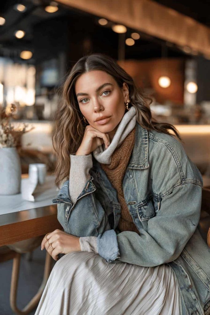 L’association d’une veste en jean , d’un pull à col roulé douillet et d’une jupe en laine chaude crée un mélange parfait de décontraction et de féminité. Le jean apporte un contraste frais à la texture souple de la jupe.