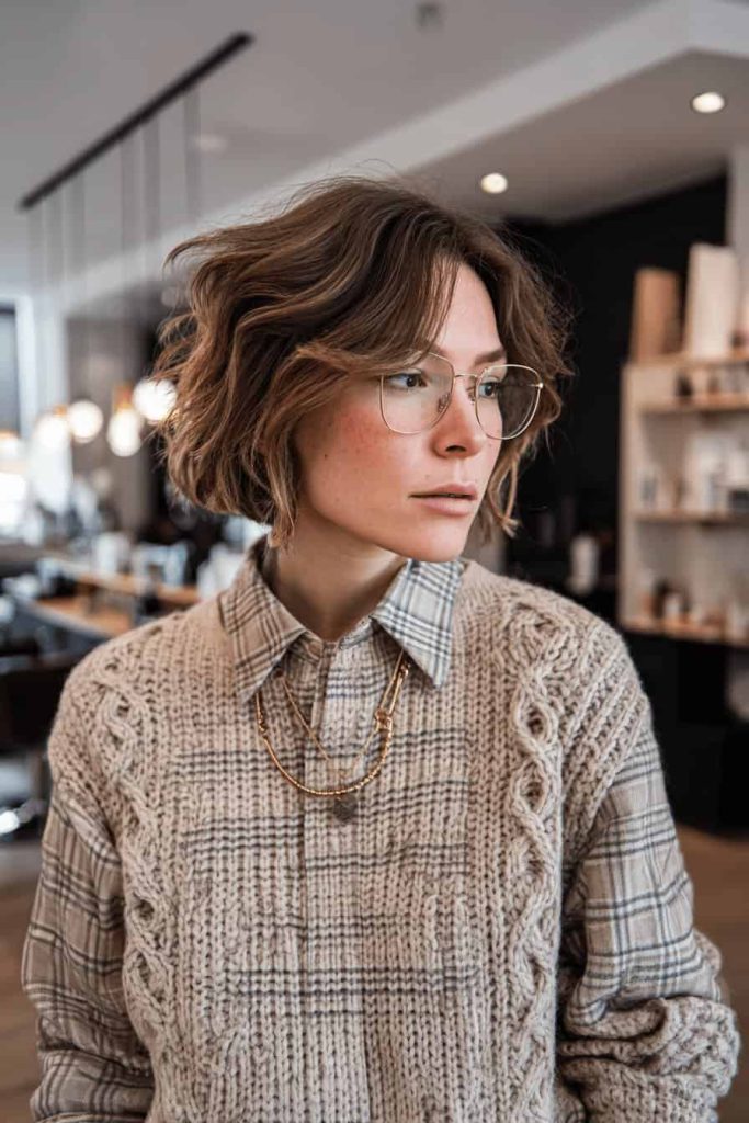 La chemise en flanelle à carreaux portée sous un gros pull en maille structure la silhouette et crée un contraste harmonieux. L’ensemble paraît plus fourni sans être surchargé, idéal pour les journées grises d’hiver. On peut y ajouter une touche personnelle avec un collier discret ou une écharpe.