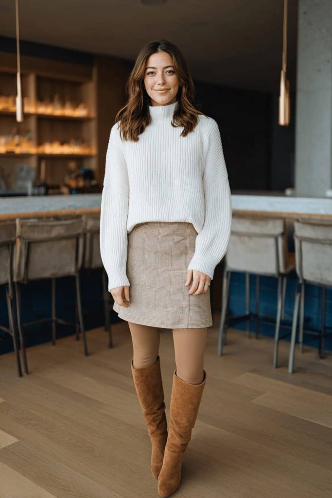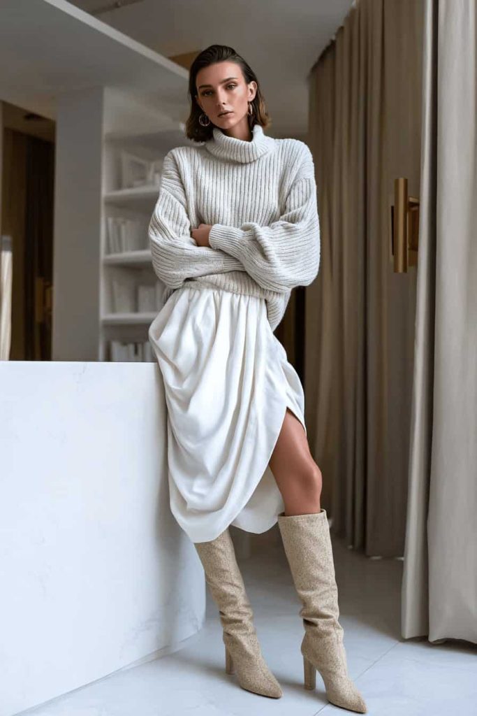 L’association d’un gros pull en maille et d’une jupe midi drapée offre un parfait équilibre entre confort et élégance, idéal au quotidien comme pour un dîner. Des bottes hautes beige clair allongent visuellement la jambe et s’harmonisent avec le reste de la tenue.