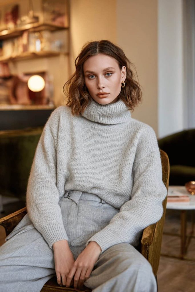 Un pull à col roulé en grosse maille gris clair se marie à un pantalon taille haute en tissu, ceinturé. L’ensemble dégage une impression à la fois sobre et structurée. Dans une tenue ton sur ton, il est important que les matières diffèrent : cela apporte du relief à l’ensemble.
