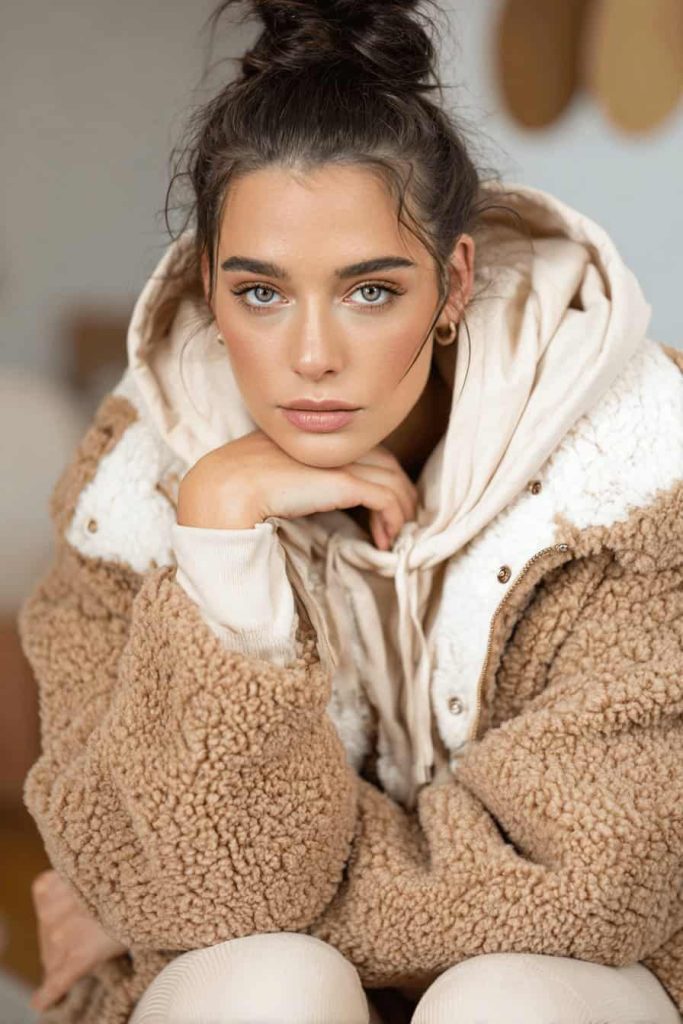 Parfois, on a juste envie d’un look aussi confortable qu’élégant. Les vestes sherpa à doublure duveteuse sont parfaites pour ces moments-là – surtout lorsqu’un sweat à capuche assorti dépasse.
