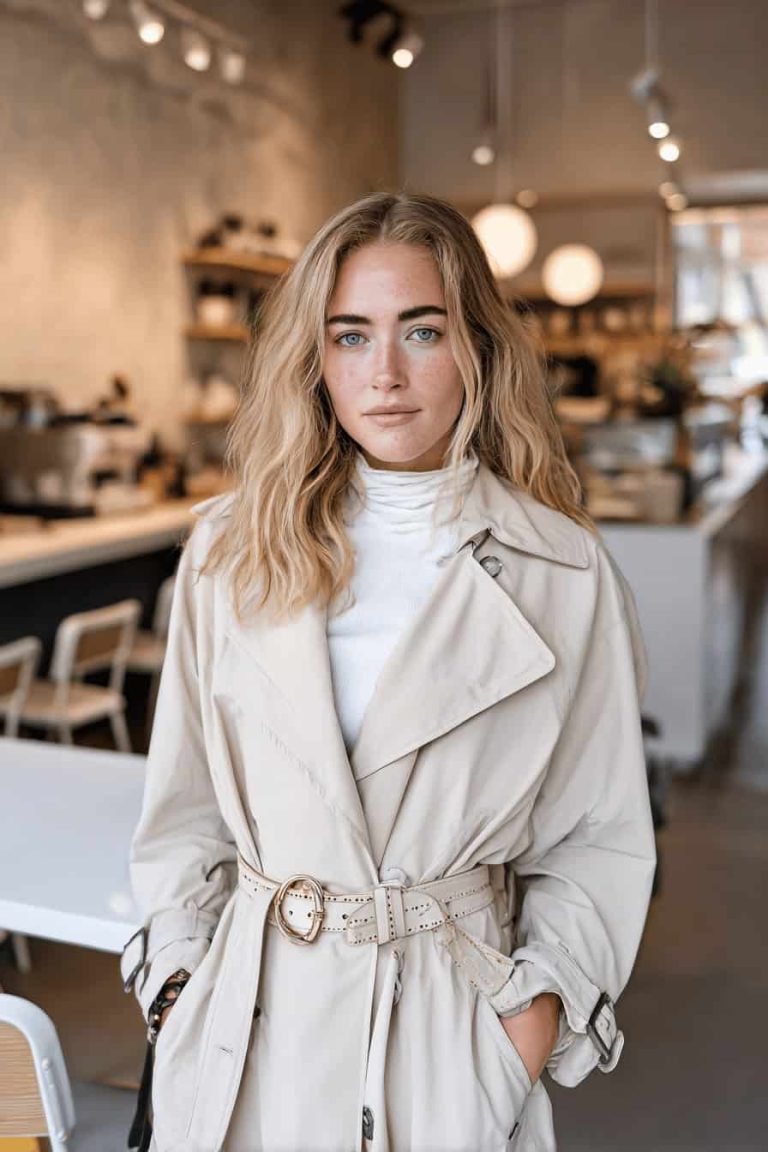 Le beige du manteau lui confère une allure élégante et se marie facilement avec des collants ou un pantalon slim. Un col roulé blanc apporte de la luminosité à la tenue tout en offrant une chaleur réconfortante.