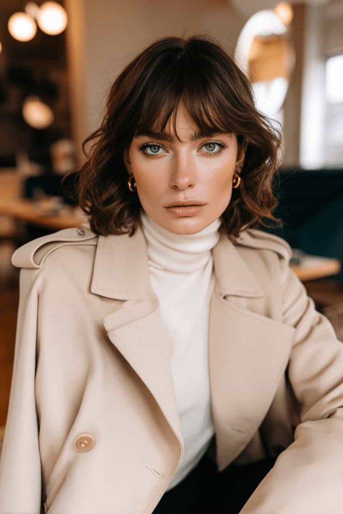 Des créoles dorées ou un maquillage discret comme sur la photo apportent une touche subtile, sans fioritures. Important : assurez-vous que le manteau soit bien ajusté pour éviter une silhouette trop volumineuse.