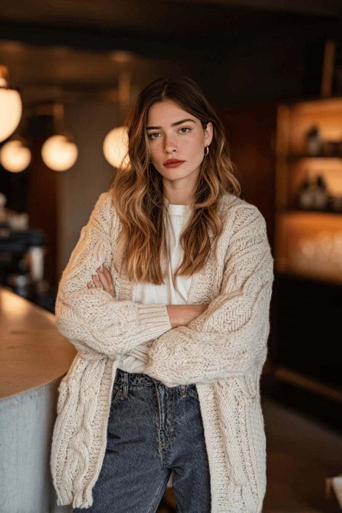 Un cardigan en grosse maille apporte immédiatement une touche de confort, surtout dans des tons clairs et naturels. Associé à un jean taille haute , il crée un look décontracté mais résolument moderne grâce à sa coupe et son volume. Une simple chemise en dessous apporte une touche minimaliste et agréable à l’ensemble.