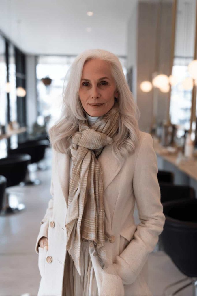 Le manteau en laine couleur crème délicate, à la coupe structurée, confère à la silhouette une élégance raffinée , tandis que l’écharpe drapée, au motif discret, apporte une chaleur décontractée. La superposition des vêtements assure un confort optimal sans alourdir la silhouette. Des accessoires d’hiver discrets et des couleurs neutres s’accordent particulièrement bien avec cette tenue.