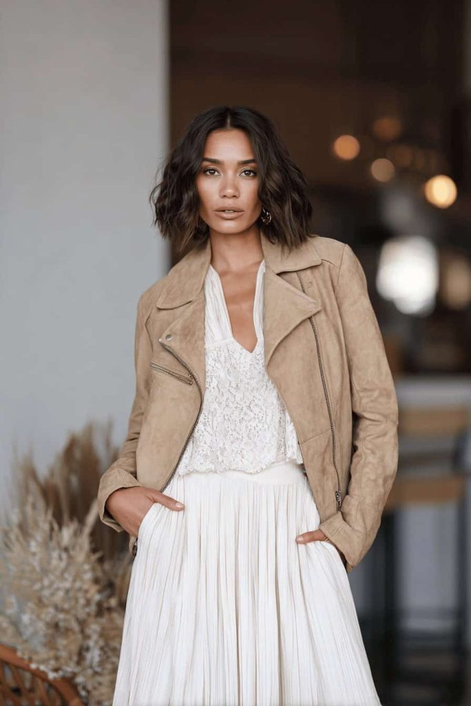 L’association d’une veste en daim zippée et d’une jupe longue plissée blanc crème apporte mouvement et texture à la tenue. Le délicat empiècement en dentelle sur le haut ajoute une touche d’élégance sans en faire trop.