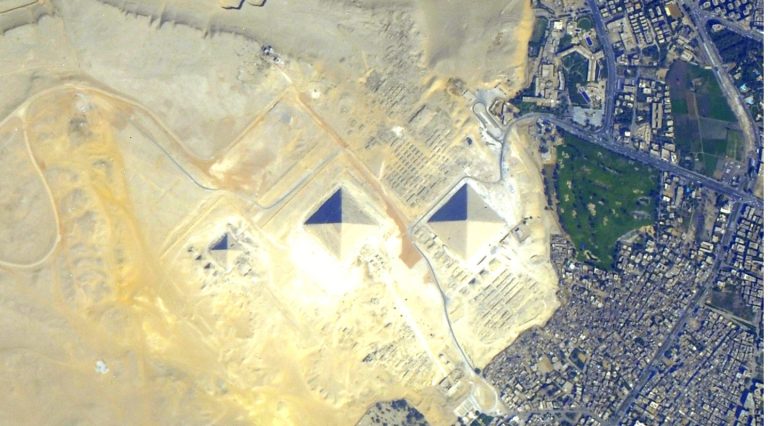 Voyez-vous une paire de petites ombres triangulaires au centre de cette photo ? Ces ombres, et la petite tache juste en dessous, font en fait partie des constructions les plus époustouflantes jamais construites par les humains. Ce sont trois des pyramides égyptiennes antiques les plus connues : les pyramides de Gizeh. Le plus grand des trois mesure près de 150 metres de haut, mais vu de l’espace, il ressemble à une petite tache dans le désert égyptien.