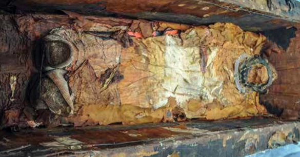 La momie semble être celle d’un monarque dynastique puisqu’elle est ornée de nombreux ornements en or.