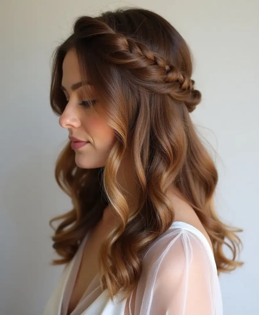 La demi-queue est une valeur sûre pour les cheveux mi-longs. En y ajoutant deux torsades sur les côtés, vous obtenez une coiffure délicate, féminine et idéale pour toutes les occasions : bureau, rendez-vous galant, sorties entre amis ou cérémonies. C’est une option parfaite pour dégager légèrement le visage tout en laissant le reste de la chevelure libre.