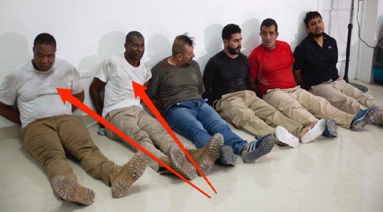 L’image ci-dessus montre James Solages (à gauche), 35 ans, et Joseph Vincent, 55 ans (deuxième à gauche) détenus à la Direction générale de la police à Port-au-Prince, Haïti, selon l’Associated Press (AP). Ils sont avec quatre autres suspects anonymes, qui, selon des responsables, sont colombiens. Tous semblent être retenus par les mains, et Vincent peut être vu avec des menottes à fermeture éclair.