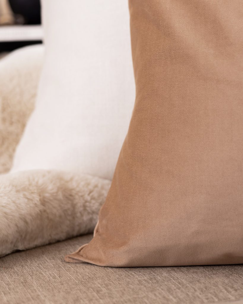 Voici deux de mes nouvelles housses de coussin, l’une en velours camel et l’autre en lin de soie ivoire, dans mon salon.