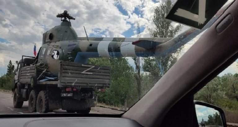 Deux mois plus tard, un chauffeur a photographié des camions de l’armée russe transportant les trois anciens Mi-2 ukrainiens désormais sans rotor.