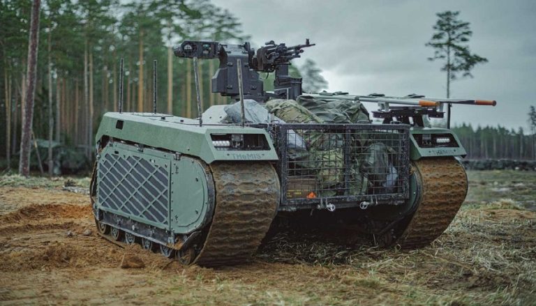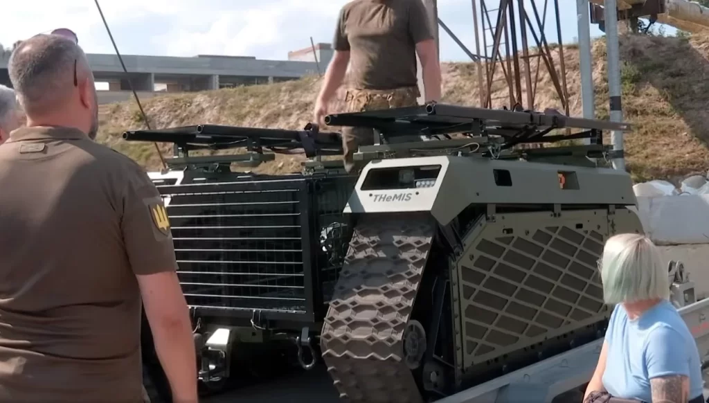 Des messages sur Twitter montraient des militaires ukrainiens debout autour du système d’infanterie modulaire hybride à chenilles (THMIS), qui a été décrit comme un véhicule multi-terrain, autopropulsé et télécommandé avec une vitesse maximale de 25 kilomètres à l’heure, arborant une monture caméra.