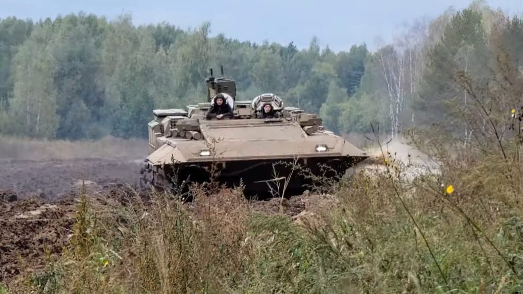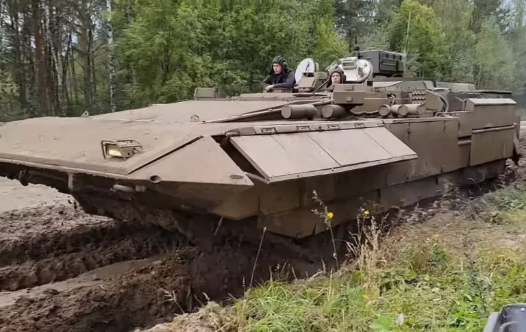 Capture d’écran d’une vidéo montrant le véhicule de combat lourd en variante de commandement, qui partage le même châssis “Armata” que le char de combat principal T-14.