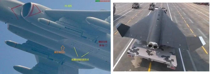 Deuxièmement, il a deux boucles sur le dessus du fuselage au-dessus de sa colonne vertébrale, ce qui signifie qu’il serait probablement lancé depuis un avion. Une photo d’un H-6N et de son ventre arborant un mécanisme de montage / ancrage a été revendiquée pour spéculer sur sa compatibilité avec le DR-8. L’avion est une plate-forme potentielle pour le lancer.