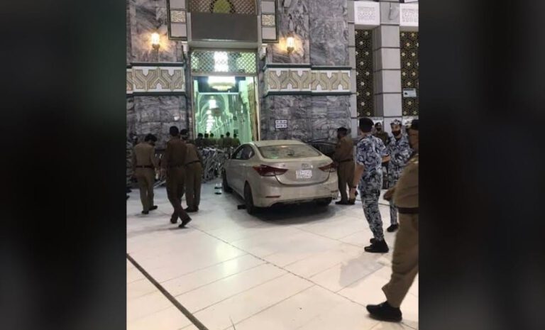 Une voiture quitte la route et fait irruption dans l'esplanade de la mosquée sacrée -Al Haram- de #Makkah et heurte une de ses portes. pic.twitter.com/7RsiDYib7Y