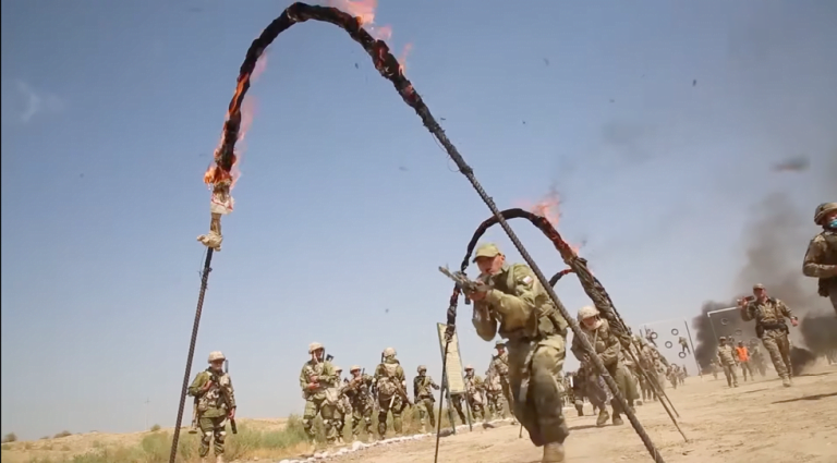 Exemple concret : les troupes de Spetsnaz ont dû faire un parcours d’obstacles avec leurs collègues ouzbeks, dont une section en feu. Les cerceaux enflammés (cercles de feu brûlants, si vous voulez) et d’autres obstacles sont des tâches d’entraînement notoirement courantes dans les pays autoritaires.