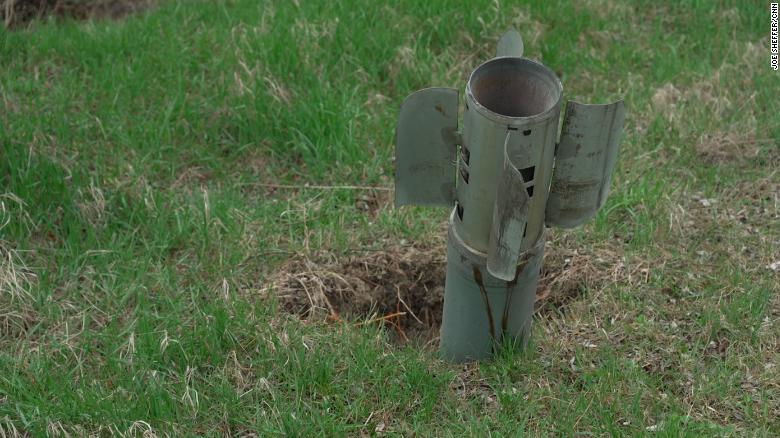 D’énormes rainures sont visibles là où les troupes avaient tiré des missiles grad depuis un champ, situé à quarante kilomètres (environ 25 milles) de la capitale. Dans les bois, des disques de missiles grad qui avaient été lancés et des caisses de munitions jonchent le sol aux positions de lancement.
