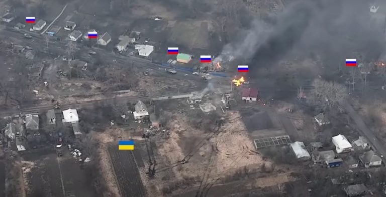 La vidéo, relayée par de nombreux médias américains et britanniques, dont le The Independent, a été filmée la semaine dernière depuis un drone qui survolait la petite ville de Nova Basan, à environ 80 km à l’est de Kiev, en Ukraine. On y voit un char ukrainien T-64 se cacher en embuscade derrière des habitations, en attendant, seul, l’arrivée de plusieurs blindés russes.
