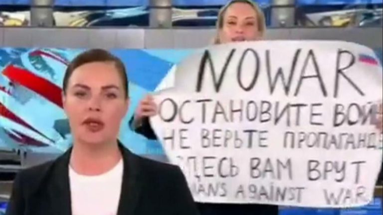 Un manifestant anti-guerre tenant une pancarte a interrompu l’une des principales émissions d’information de la télévision d’État russe vers 21h31. heure de Moscou.